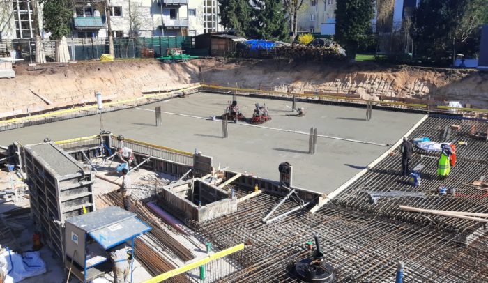 Baustellen-updateIn Fürth befinden wir uns mitten im ersten Bauabschnitt und sind dabei eine flügelgeglättete Bodenplatte auf dem Gefälle der neuen Tiefgarage zu erstellen.