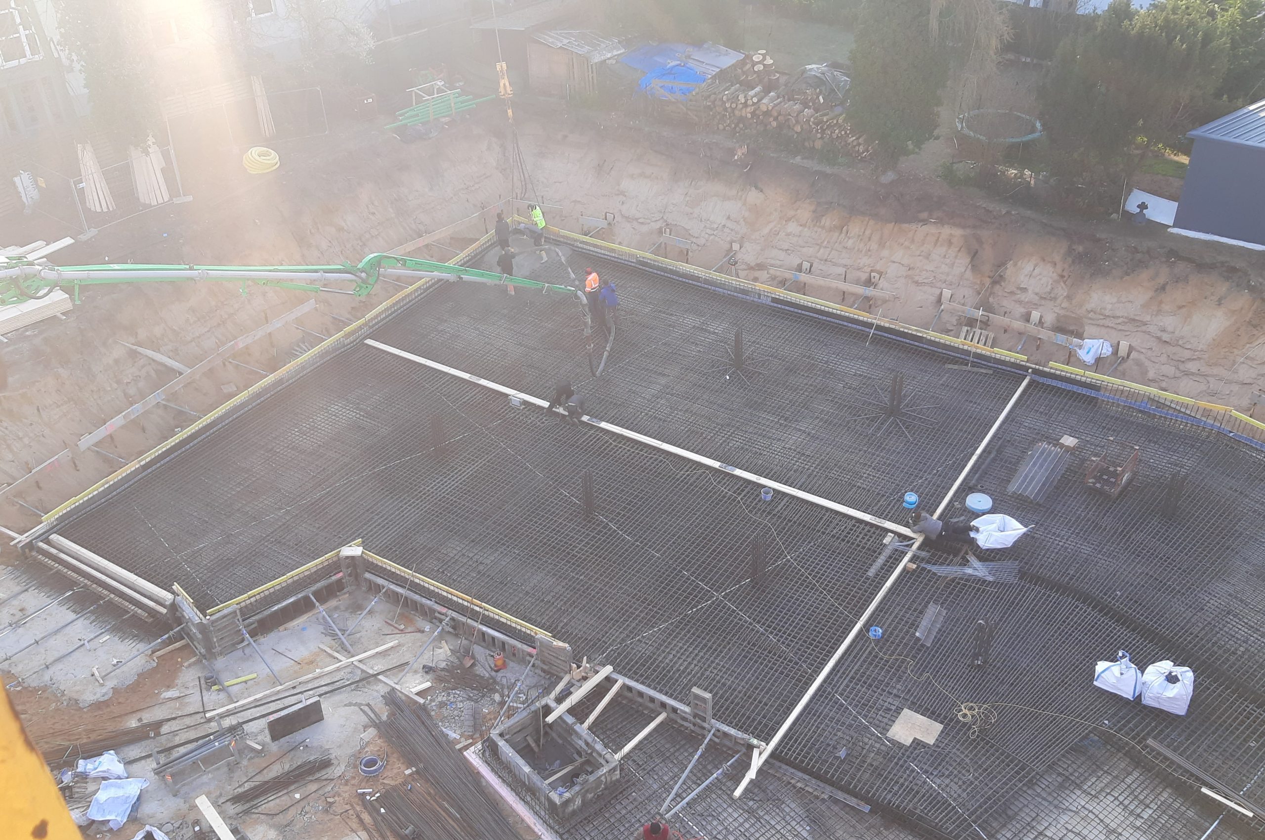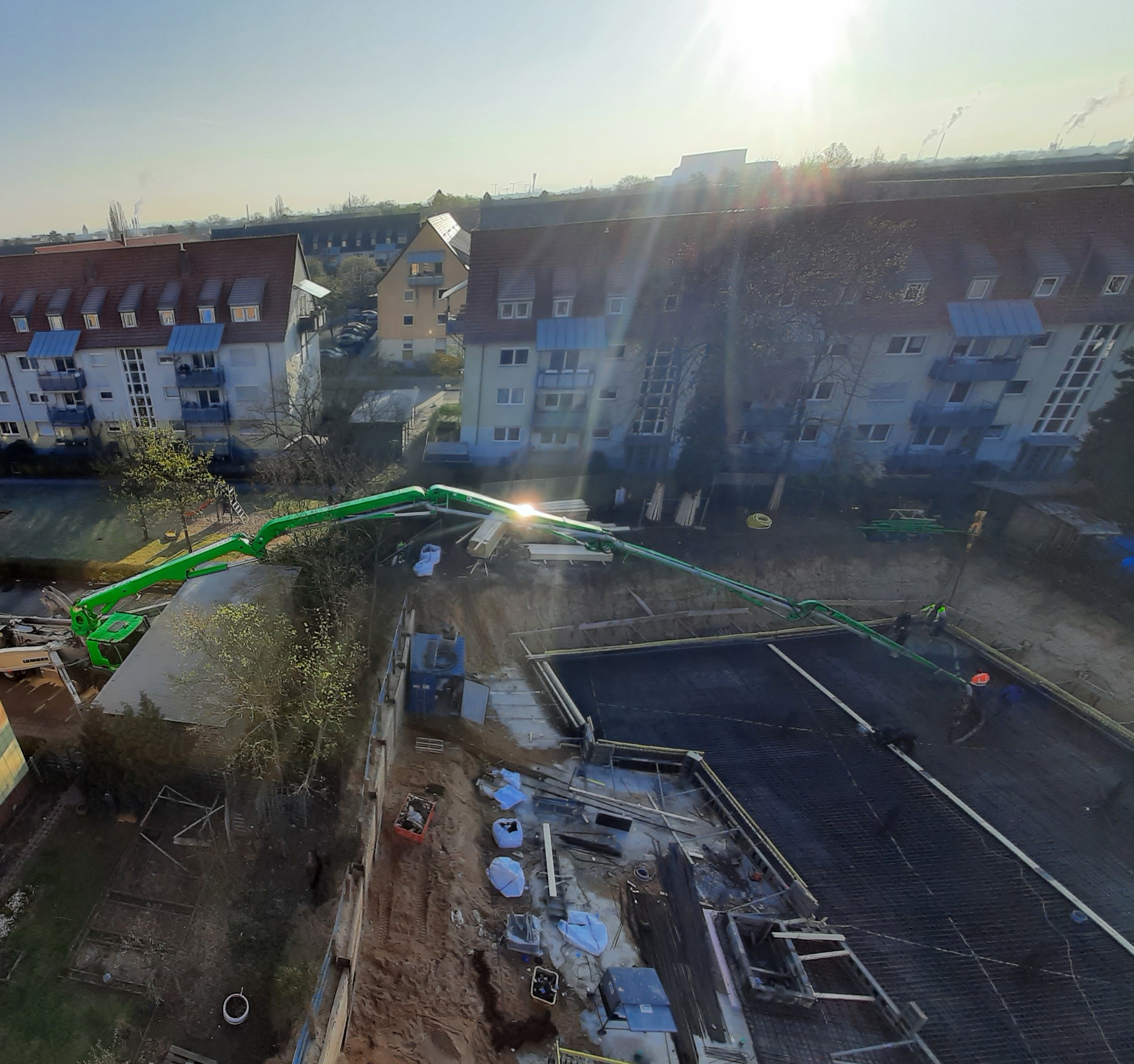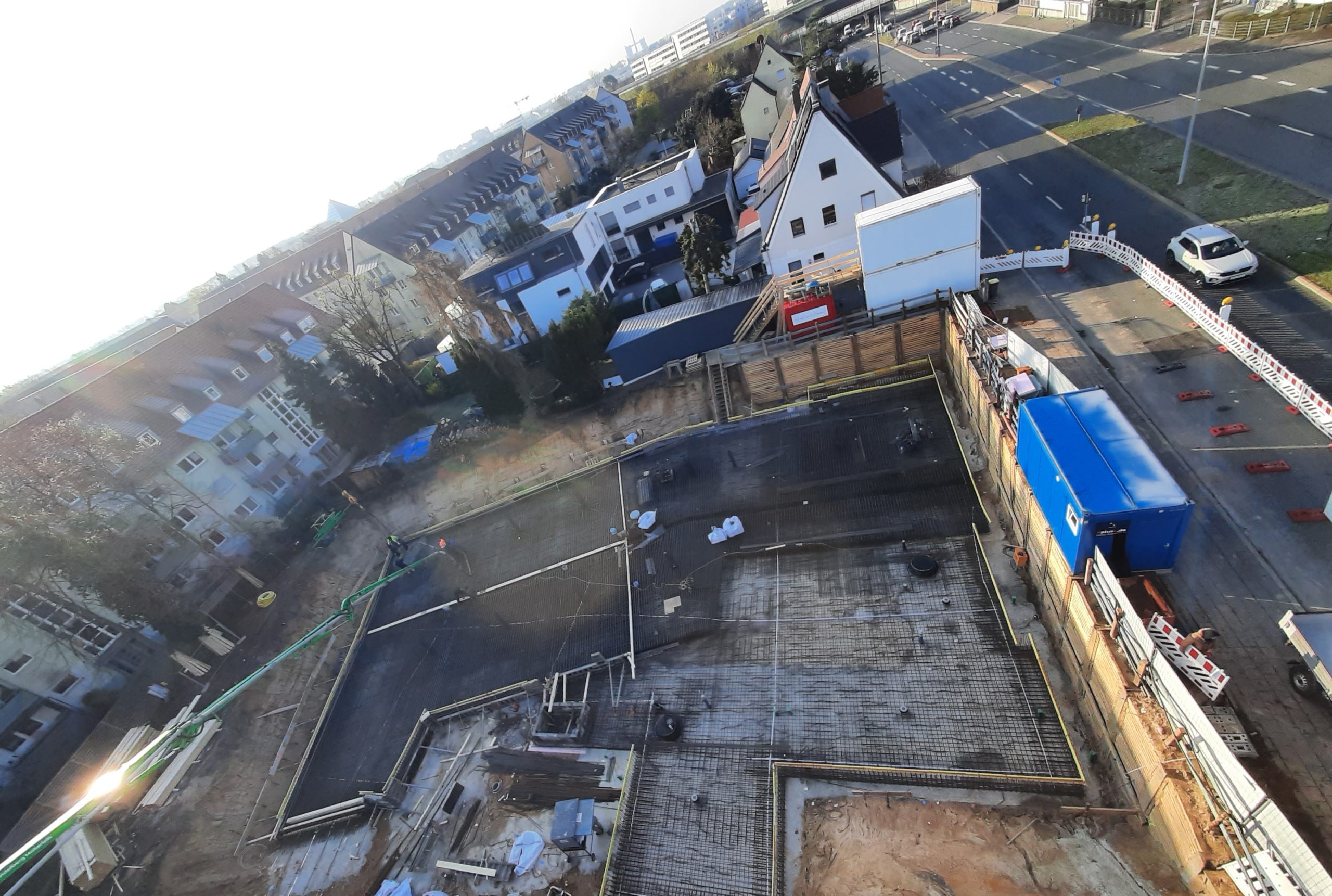 In Fürth befinden wir uns mitten im ersten Bauabschnitt und sind dabei eine flügelgeglättete Bodenplatte auf dem Gefälle der neuen Tiefgarage zu erstellen.